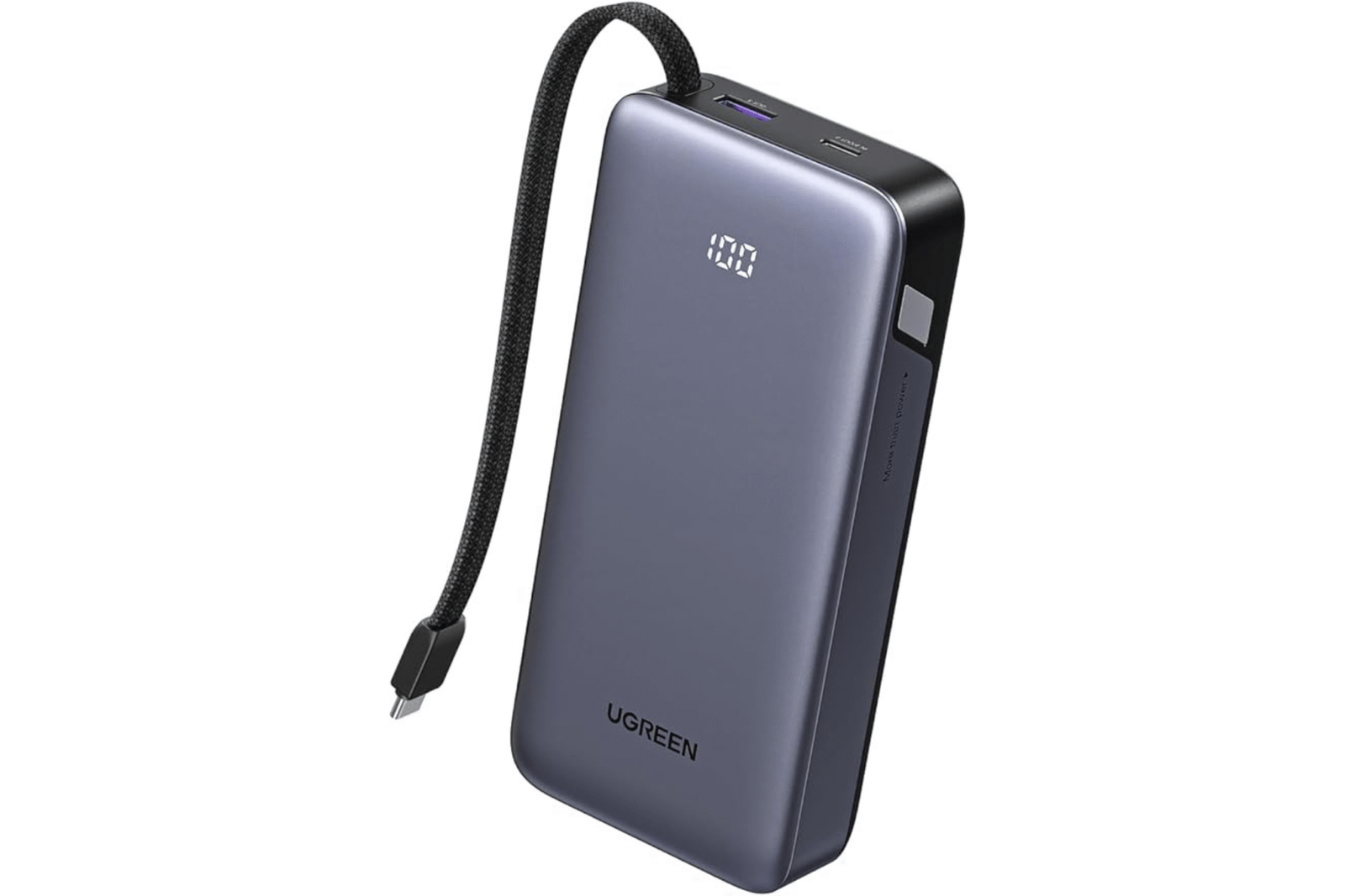 يوجرين بنك طاقة 45W بسعة 20000mAh يجي مع كابل USB-C مدمج ومنفذين USB-C وUSB-A، مع شاشة LED لمتابعة نسبة البطارية. يدعم شحن سريع PPS 45 واط، ومتوافق مع iPhone 16 Pro Max، 15، وGalaxy S25 Ultra. تصميمه عملي وسهل الحمل، مثالي للاستخدام اليومي والتنقل.
